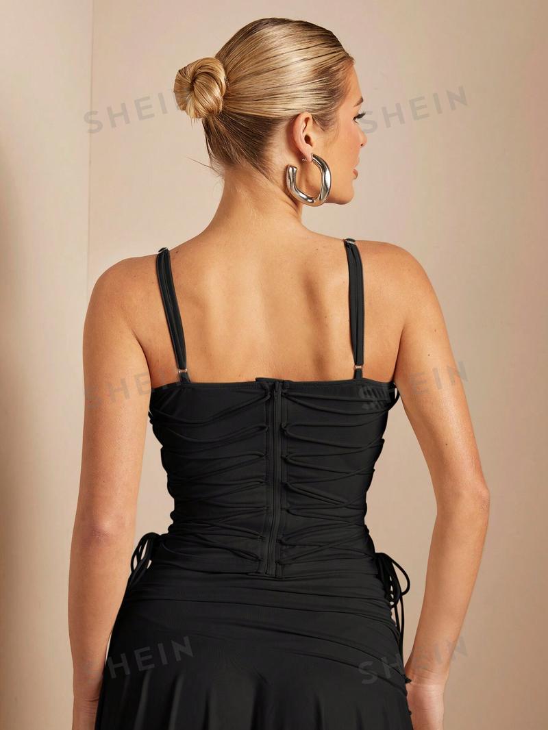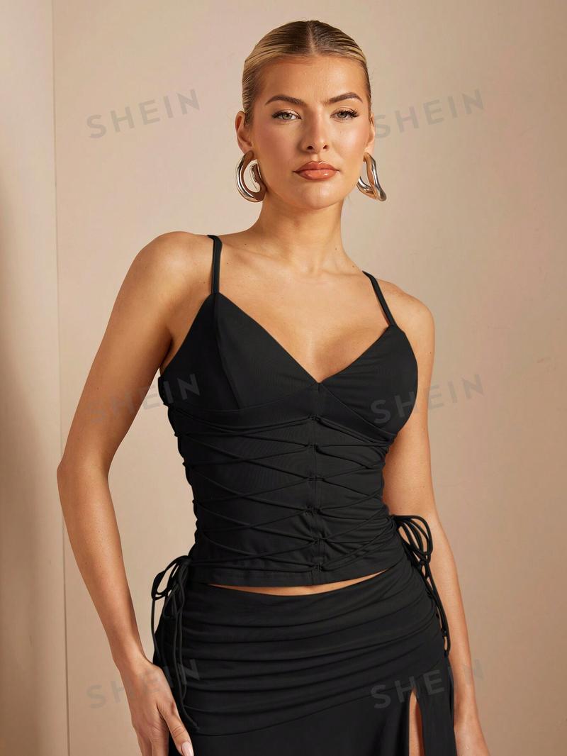SHEIN BAE Однотонный топ на бретельках с молнией сзади и завязками, черный