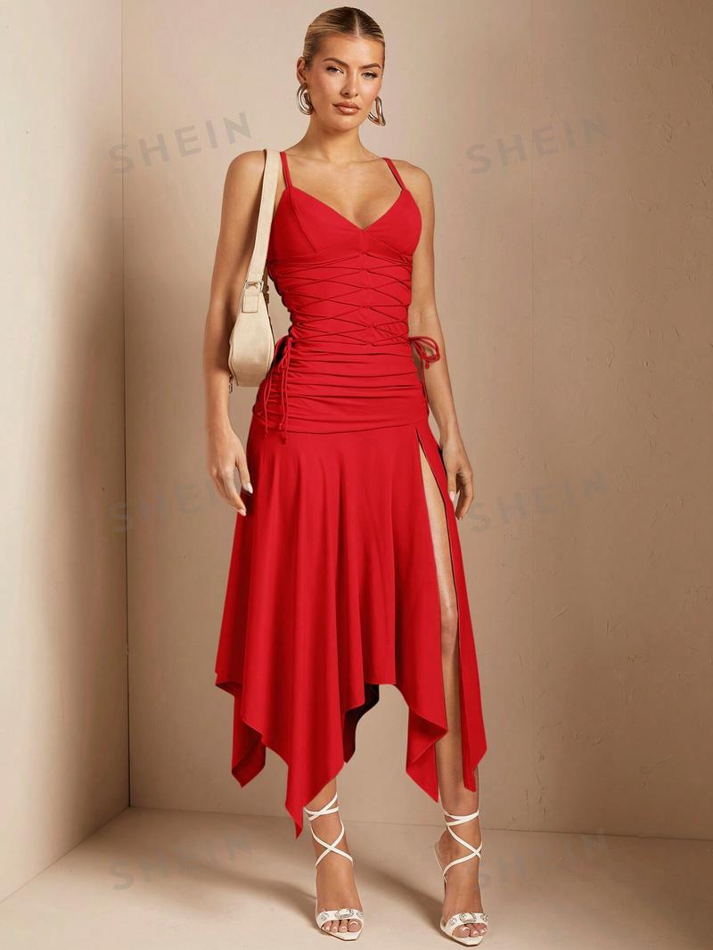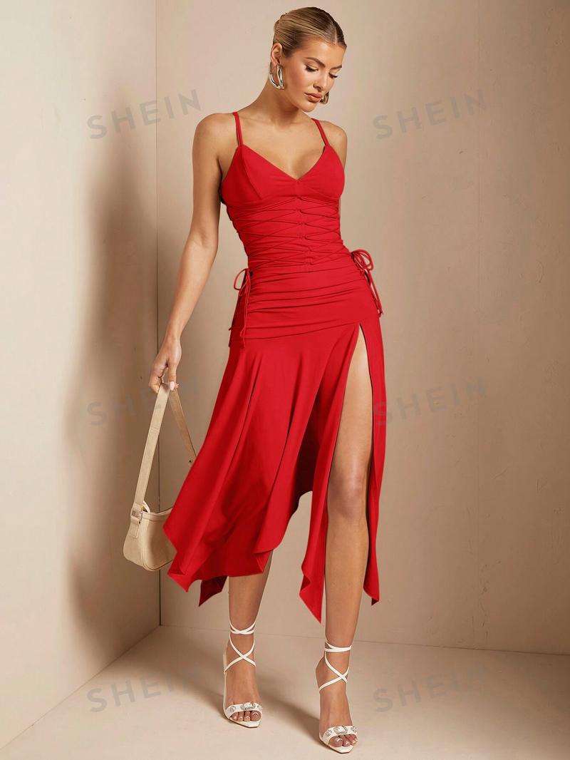 SHEIN BAE Однотонный топ на бретельках с молнией сзади и завязками, красный