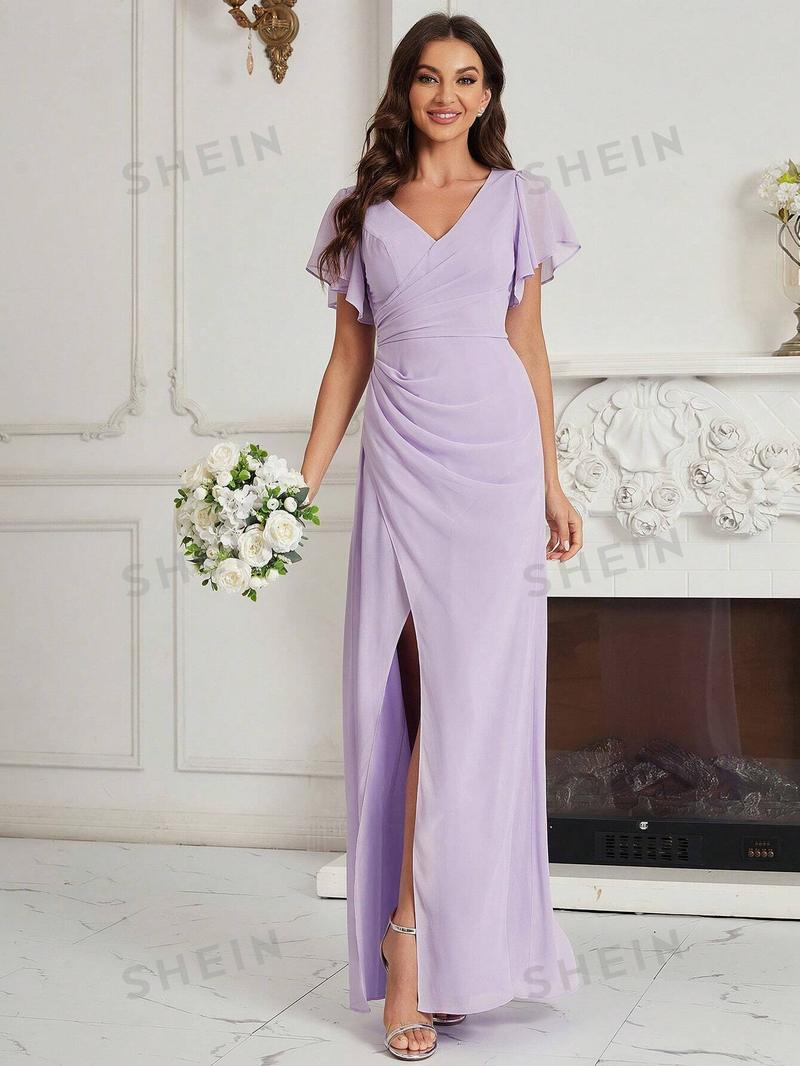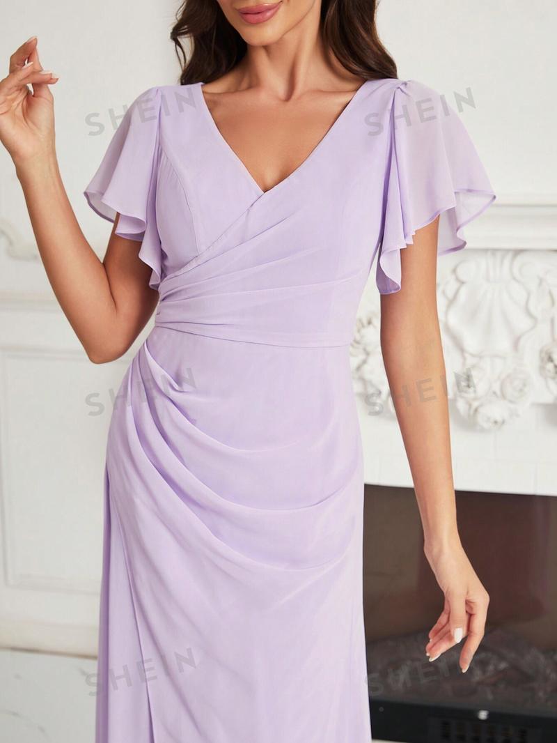 SHEIN Belle Женское платье для подружки невесты с v-образным вырезом и листьями лотоса, сиреневый фиолетовый