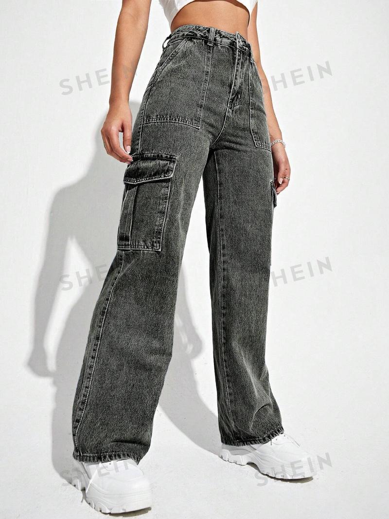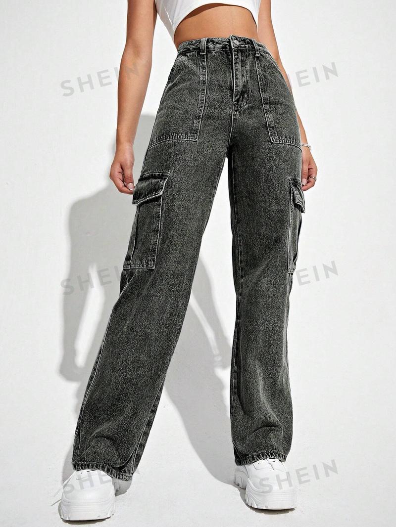 SHEIN Coolmax Джинсовые брюки с карманами и откидными карманами в стиле рабочей одежды, темно-серый