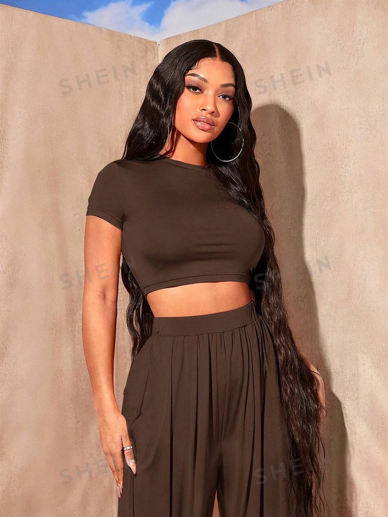 SHEIN SXY Женская укороченная футболка однотонного цвета и широкие плиссированные брюки 2 шт./компл., шоколадно-коричневый