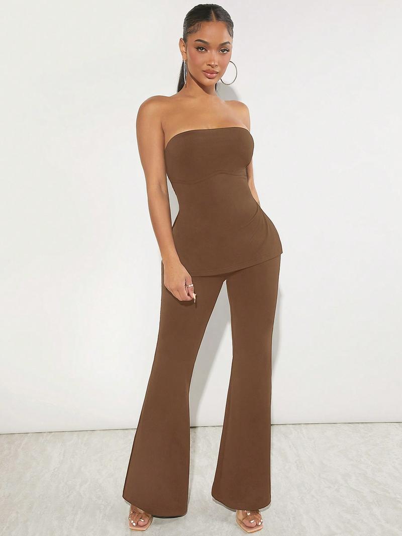 SHEIN SXY женский однотонный укороченный топ без бретелек с боковым разрезом и расклешенными брюками, кофейный коричневый