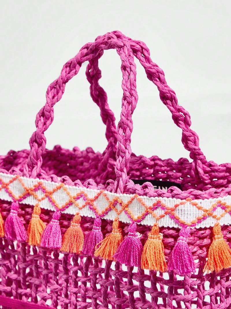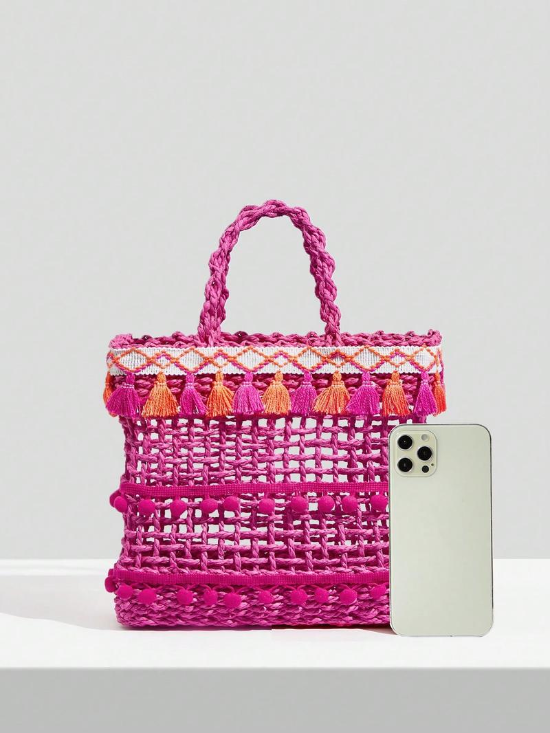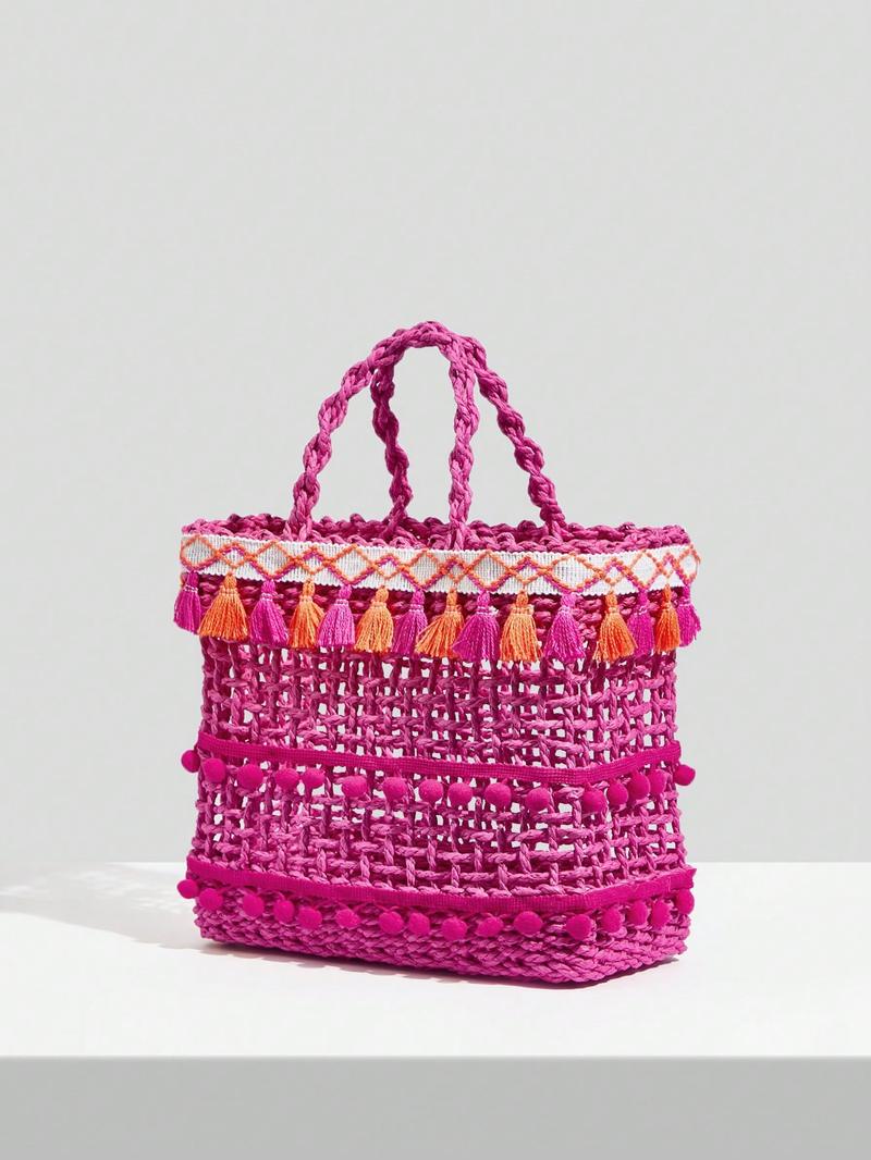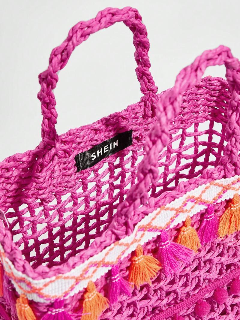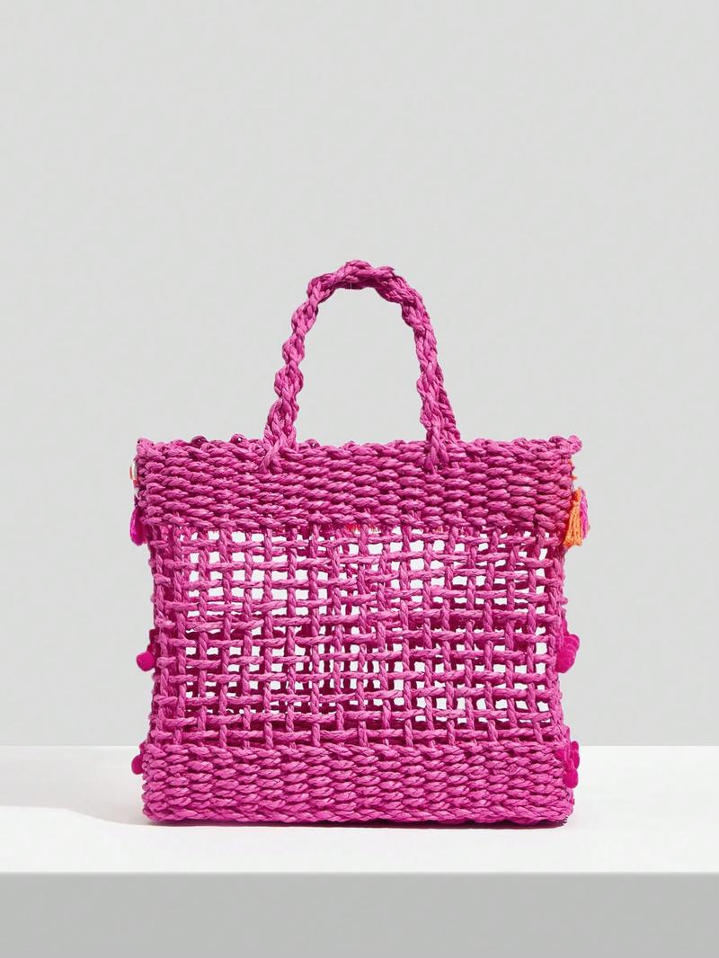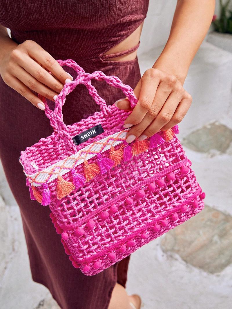SHEIN VCAY Маленькая соломенная сумка с помпоном, ярко-розовый