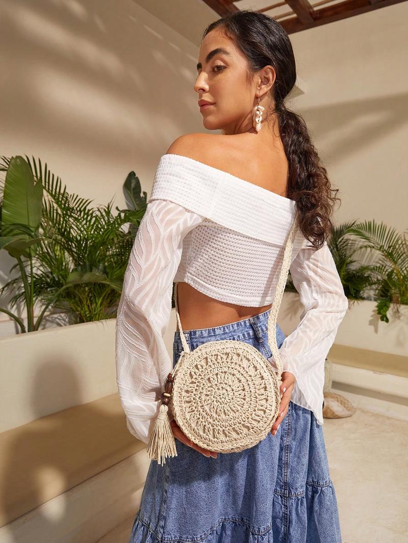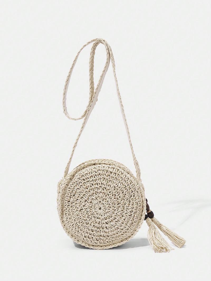 SHEIN VCAY Соломенная круглая сумка с отделкой бисером, абрикос